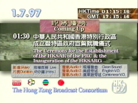 Diese Testkarte war am 1.7.1997 anläßlich der Übergabe von Hong Kong an China nach der Übertragung der Feierlichkeiten auf einem TELECOM-Satelliten zu sehen.